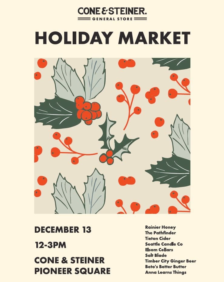 We are going to have 9 Seattle based vendors at our Pioneer Square store at 135 S King Street on Saturday December 13th from 12:00-15:00.
