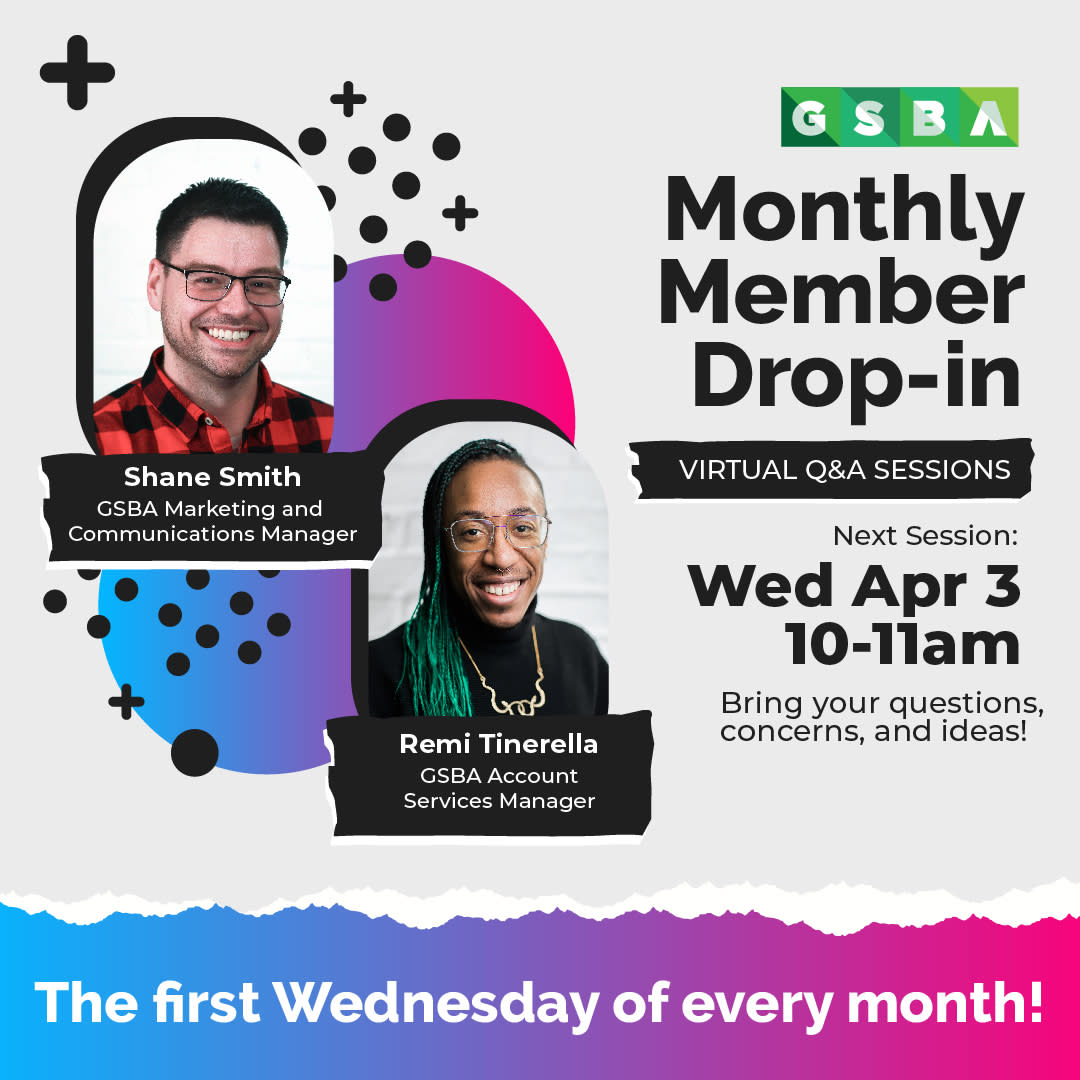 On the first Wednesday of every month, GSBA invites you to virtually "drop by" with any issues, questions, or just to say "hello!" Hosted by Remi Tinerella (he/him), GSBA Account Services Manager and Shane Smith (he/him), Marketing and Communications Manager, this monthly block of time is a space for members to get help with any issues they are facing using any of their GSBA benefits. Remi and Shane will be offering help on listings, posting on the job board, registering for events and fielding any questions that come up.