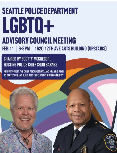 The Seattle LGBTQ+ Community Advisory Council for the Seattle Police Department is hosting Police Chief, Shon Barnes at our next community meeting on February 11th from 6–8 PM in Capitol Hill.