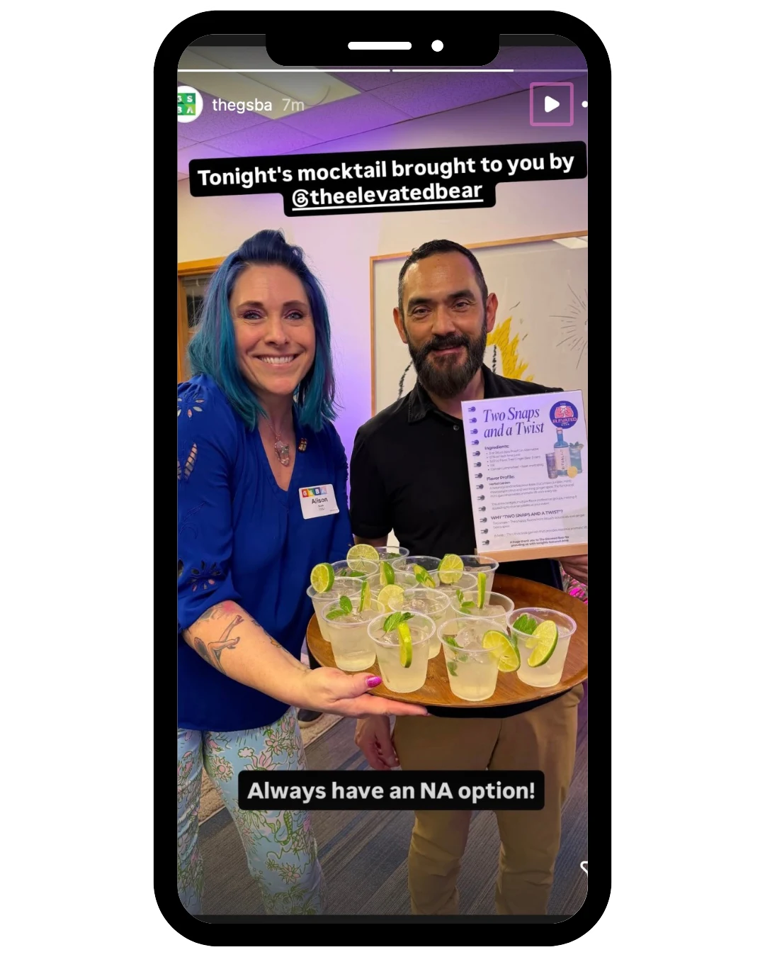 If you were at the GSBA New Member Event on February 23, you had a drink called Two Snaps and a Twist, a botanical, citrus-forward Elevated Non-Alcoholic Beverage (ENAB) built on the Buck cocktail template, featuring Ritual Zero Proof Gin Alternative, fresh lime, Fever Tree Ginger Beer, and a functional mint garnish.